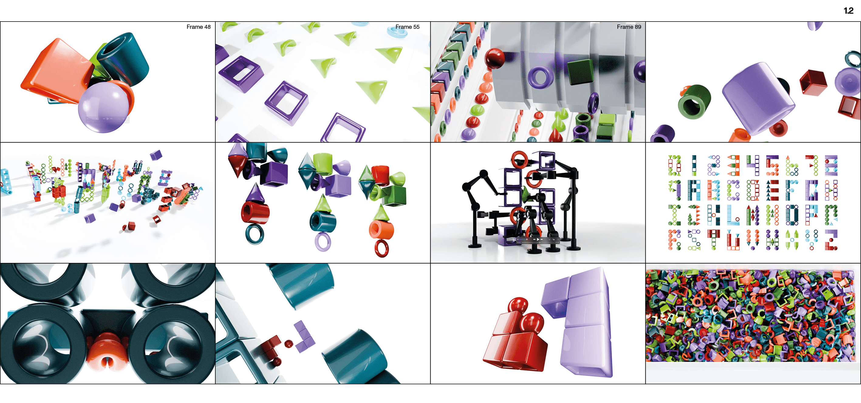 Le projet se déploie à travers une animation de formes géométriques plastiques qui s’assemblent continuellement pour constituer un alphabet. Cette écriture en devenir s’inscrit dans un univers visuel s'inspirant de l’imaginaire industriel et évoquant autant la fabrication que la transformation de la matière.